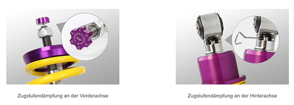 Je nach Fahrzeugtyp werden die Zugstufenventile der KW Zweirohrdämpfer am oberen Ende der Kolbenstange über ein integriertes Einstellrädchen oder dem im Lieferumfang beinhalteten Aufsteck-Einstellrädchen abgestimmt. Indem Sie über das Einstellrädchen die Zugkraft erhöhen, verringern sich die Aufbaubewegungen an der Karosserie. Ihr Auto fährt sich dadurch spurtreuer und Sie haben bei erhöhten Kurvengeschwindigkeiten noch mehr Stabilität. Wechseln Sie beispielsweise die freigegebenen Rad/Reifenkombinationen Ihres Automobilhersteller für beispielsweise größere Felgen, können Sie mit dem KW Gewindefahrwerk Variante 2 "inox-line" mit der einstellbaren Zugstufe das Fahrverhalten Ihres Autos und Ihre neuen Leichtmetallräder perfekt aufeinander anpassen.