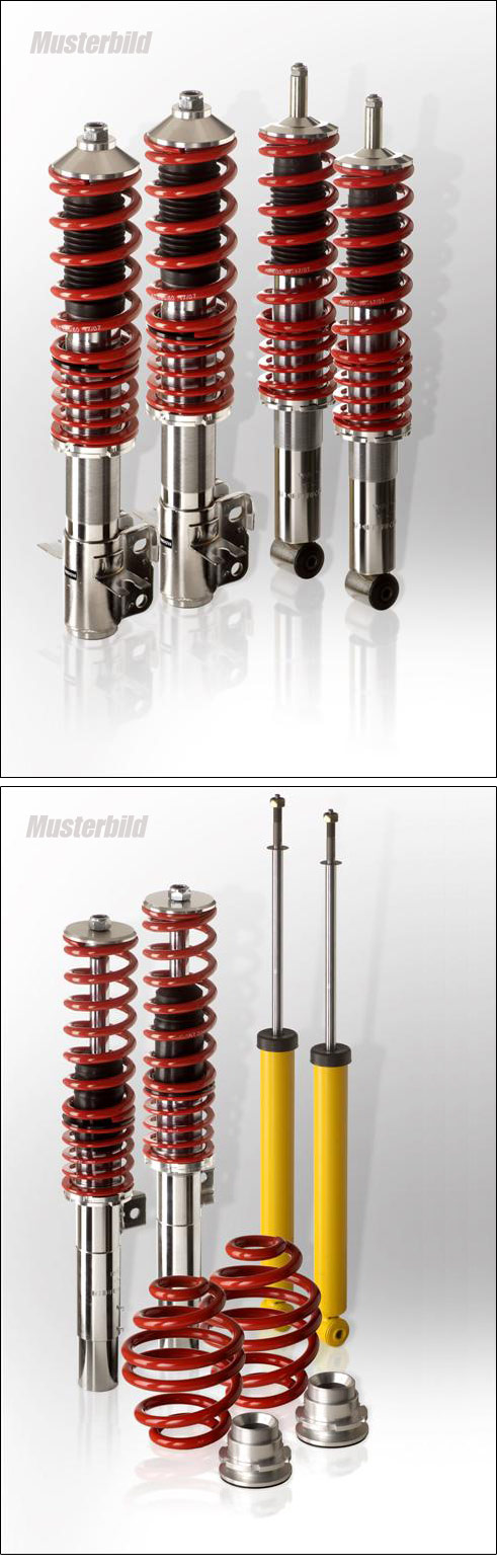 Das komplette System besteht aus schwarzen metallisierten Federn, Leichtmetall Komponenten und Elastomer Anschlaggummis mit integriertem Schutzsystem. Im Lieferumfang enthalten sind der Verstellschlüssel, Bedienungsanleitung und je nach Fahrzeugausführung die benötigten Federbeine.